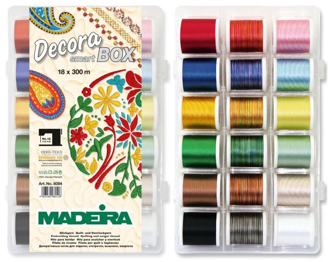 Vyšívacia niť Madeira Decora box (18x300m) je prenosný box, ktorý obsahuje 18 ks viskózových vyšívacích nití. 12 v návine 300 mv efektívnych farbách.