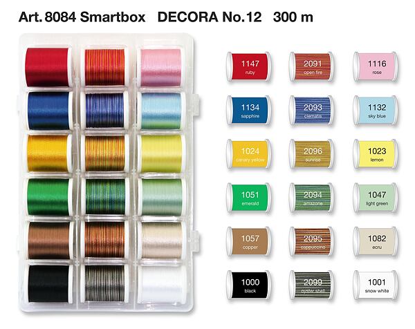 Praktický prenosný box, ktorý obsahuje 40 ks efektných metalických dekoratívnych vyšívacích nití Decora č.12 v návine 300 m. Box je vyrobený z pevného priehľadného plastu. Box slúži súčasne ako stojan na nite.
