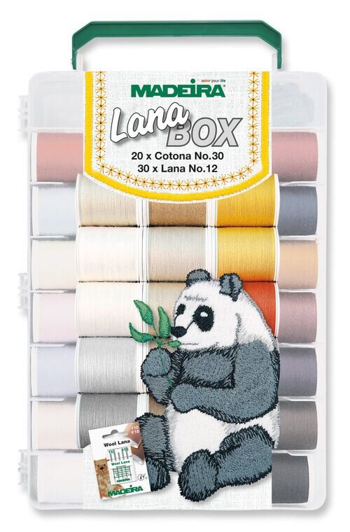 Vyšívacie nite Madeira Lana + Cotona box (50x200m) sú nite v prenosnom boxe, ktorý obsahuje 30 ks vlnených vyšívacích nití Madeira Lana pre dokonalé ručné alebo strojové výšivky imitujúce zvieraciu srsť. Box obsahuje tiež 20 kusov bavlnených vyšívacích nití Madeira Cotona, 2 ks spodných vyšívacích nití Bobbinfil a ihly na vyšívanie vlny.