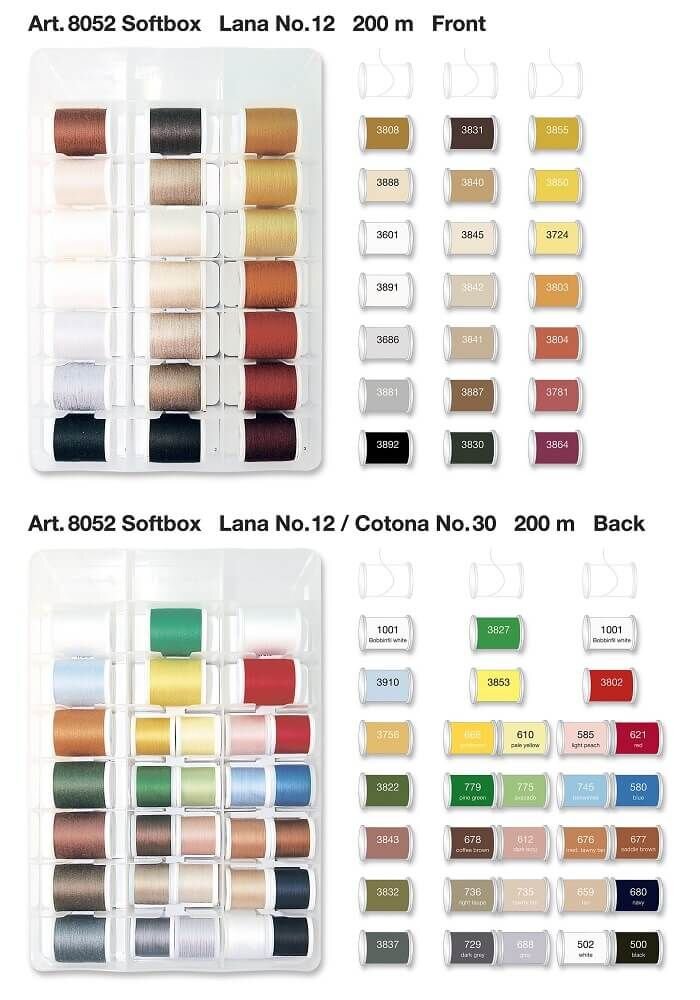 Praktický přenosný box, který obsahuje 30 ks kvalitních vyšívacích nití Madeira Lana v návinu 200 m a 20 ks nití Madeira Cotona, 2 ks cívky Bobbinfil 1500 m (spodní nit) a sadu jehel pro vyšívání vlněnou nití Madeira Lana. Box je vyroben z pevného průhledného plastu a můžete ho využívat opakovaně pro uložení nití a také jako stojan, nit můžete vést z přihrádky boxu pomocí vodiče přímo do vyšívacího stroje.