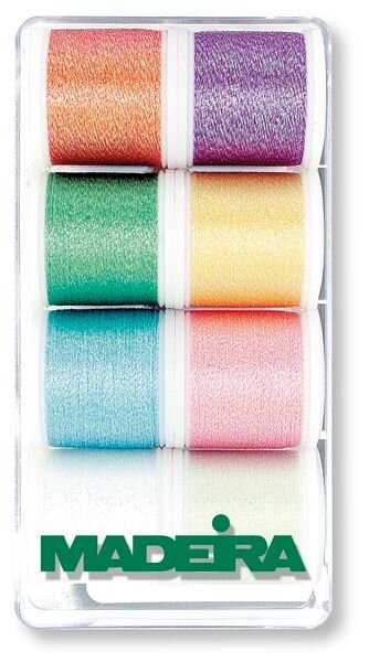 Vyšívacie nite Madeira Metallic Opal 40 box (8x200m) je prenosný plastový box, ktorý obsahuje 8 ks kvalitných vyšívacích nití Metallic Sparkling vo farbách Opal návinu 200 m.