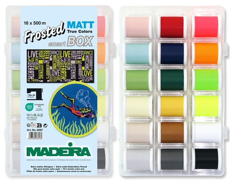 Vyšívacie nite Madeira Frosted Matt 40 Smartbox (18 x 500 m) je prenosný plastový box, ktorý obsahuje 18 ks polyesterových vyšívacích nití Frosted Matt č. 40 v návine 500 m.