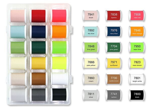 Praktický prenosný box, ktorý obsahuje 18 ks kvalitných vyšívacích nití Frosted Matt č.40 v návine 500 m. Box ďalej obsahuje tlačenú farebnicu. Box je vyrobený z pevného priehľadného plastu.