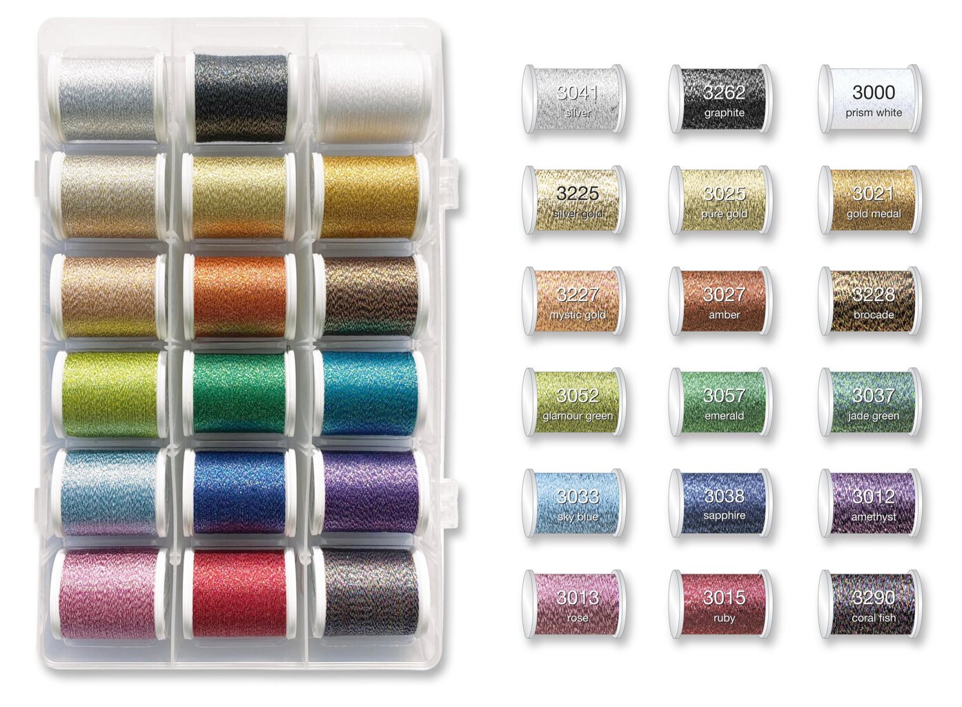 Praktický prenosný box, ktorý obsahuje 18 ks kvalitných vyšívacích nití Glamour č.12 v návine 200 ma sadu univerzálnych ihiel. Box ďalej obsahuje tlačenú farebnicu. Box je vyrobený z pevného priehľadného plastu.