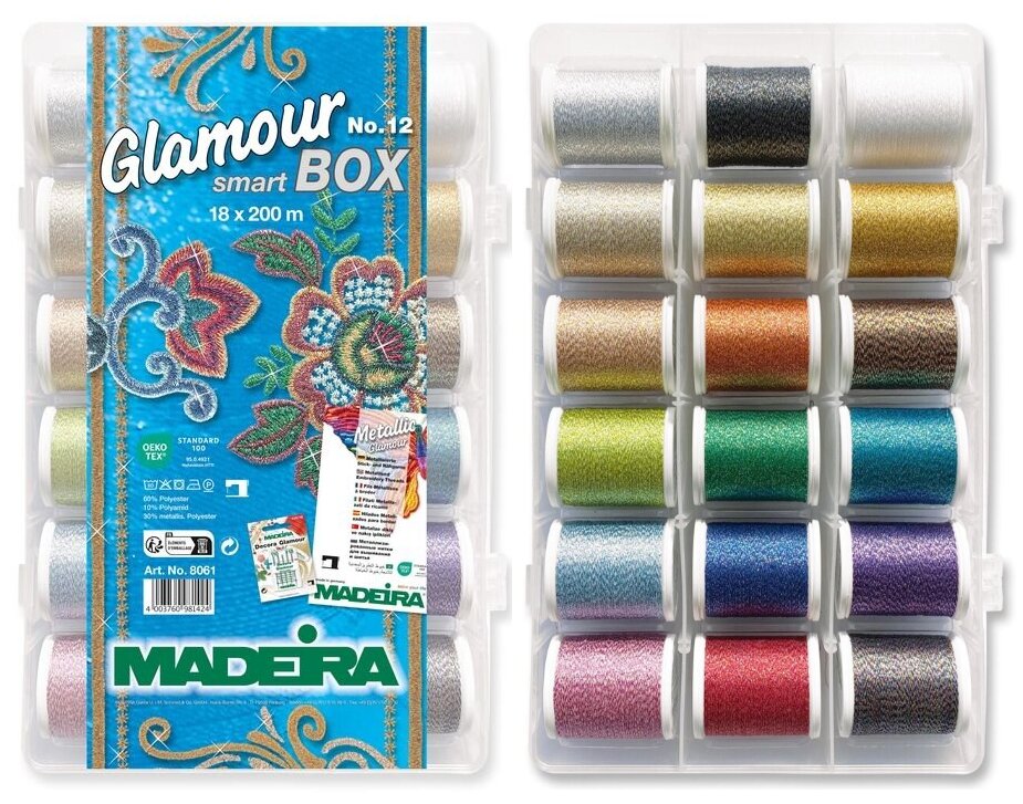 Vyšívacie nite Madeira Glamour 12 Smartbox (18 x 200 m) je prenosný plastový box, ktorý obsahuje 18 ks polyesterových vyšívacích nití. 12 v návine 200 m.