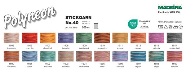 Niť Madeira Polyneon je polyesterová niť, ktorá je ideálna na vytváranie výšiviek na športovom oblečení, plavkách a často praných materiáloch. Vyšívacia niť Madeira Polyneon je odolná niť, vhodná pre strojové vyšívanie, prešívanie, dekoratívne šitie aj šitie aplikácií. Nite Polyneon sú extrémne odolné. Polyneónové farby zostávajú žiarivé, výrazné a lesklé aj po častom praní a vystavovaní slnečnému svetlu, chlóru alebo oderu. Na vyšívanie nití Polyneon odporúčame použitie ihiel 80/12.