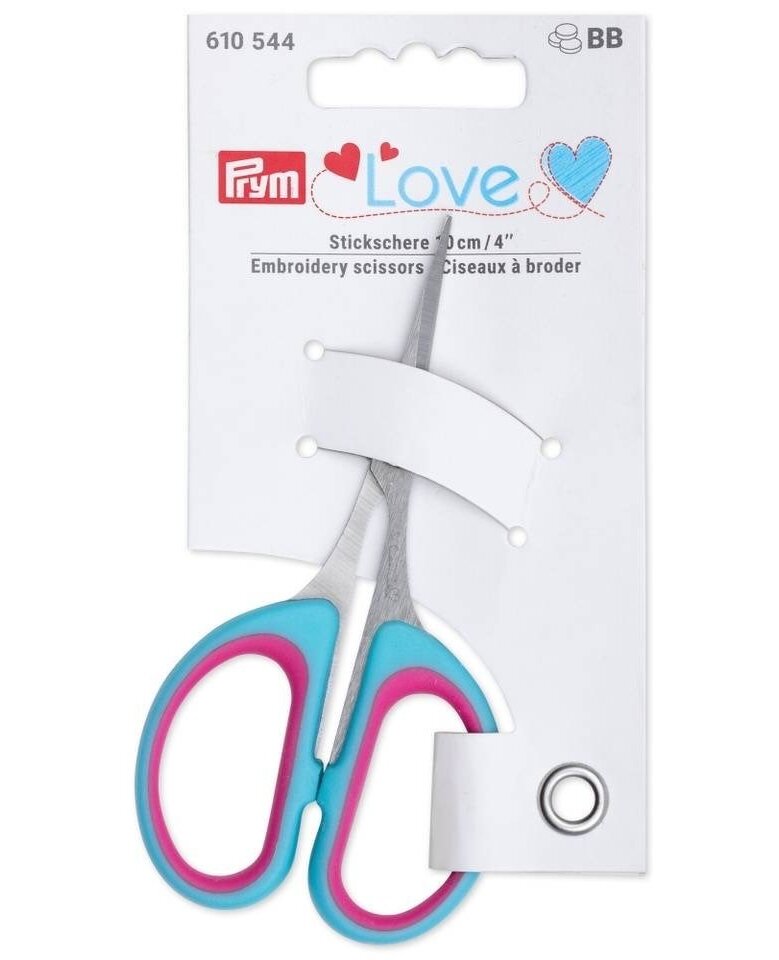 obchod@raj-sitia.skVyšívacie nožnice (10 cm) - PRYM LOVE sú jemné vyšívacie nožnice určené na vyšívanie. Nožnice majú presne brúsený hrot a tak nikdy nestrihnete vedľa. Farebné plastové rukoväte majú mäkký vnútorný krúžok, čo zaisťuje pohodlné uchopenie.