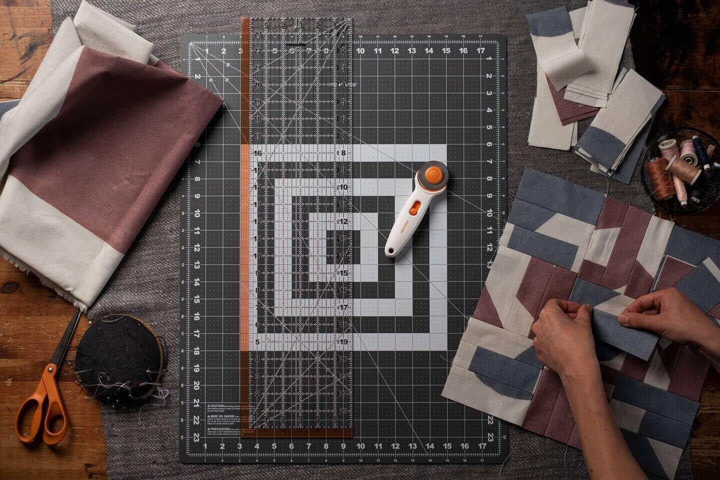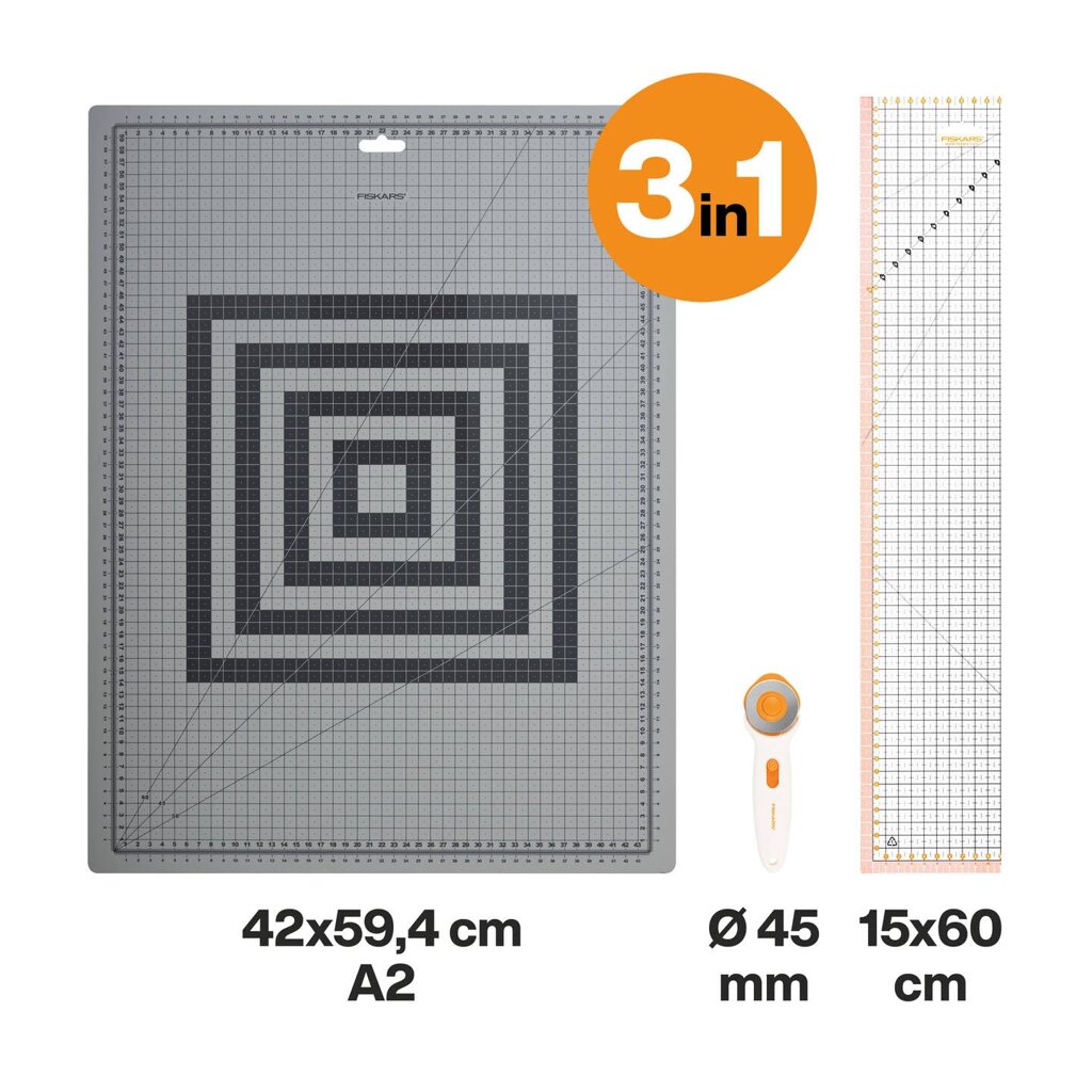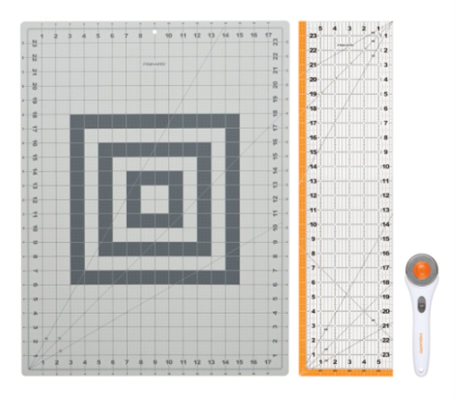 Súprava na patchwork a šitie FISKARS obsahujúca rezaciu podložku, priehľadné pravítko a kruhový rezač s rezacím kolieskom Vďaka tejto sade bude rezanie látky jedna radosť.