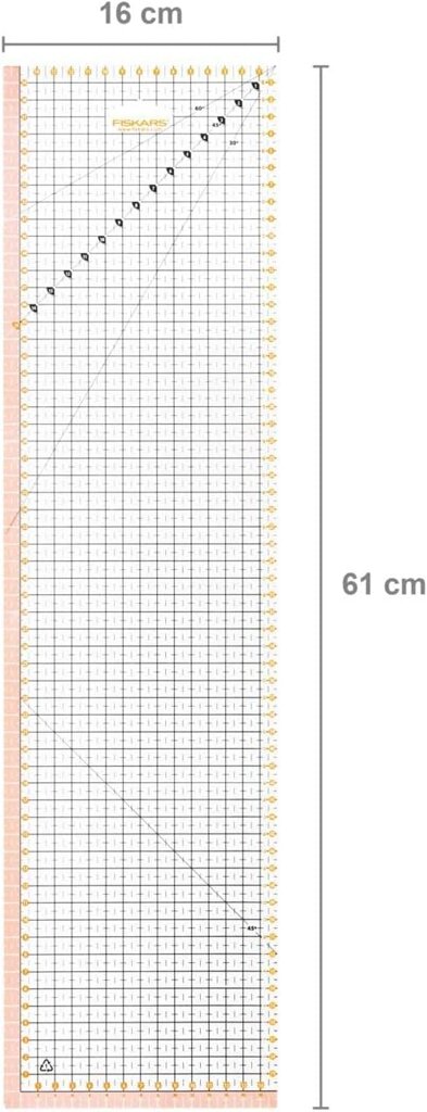 - Priehľadné pravítko 15 x 60 cm FISKARS s mierkou v cm a zvýrazneným prídavkom na šev.