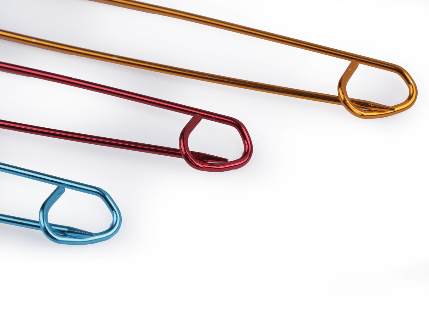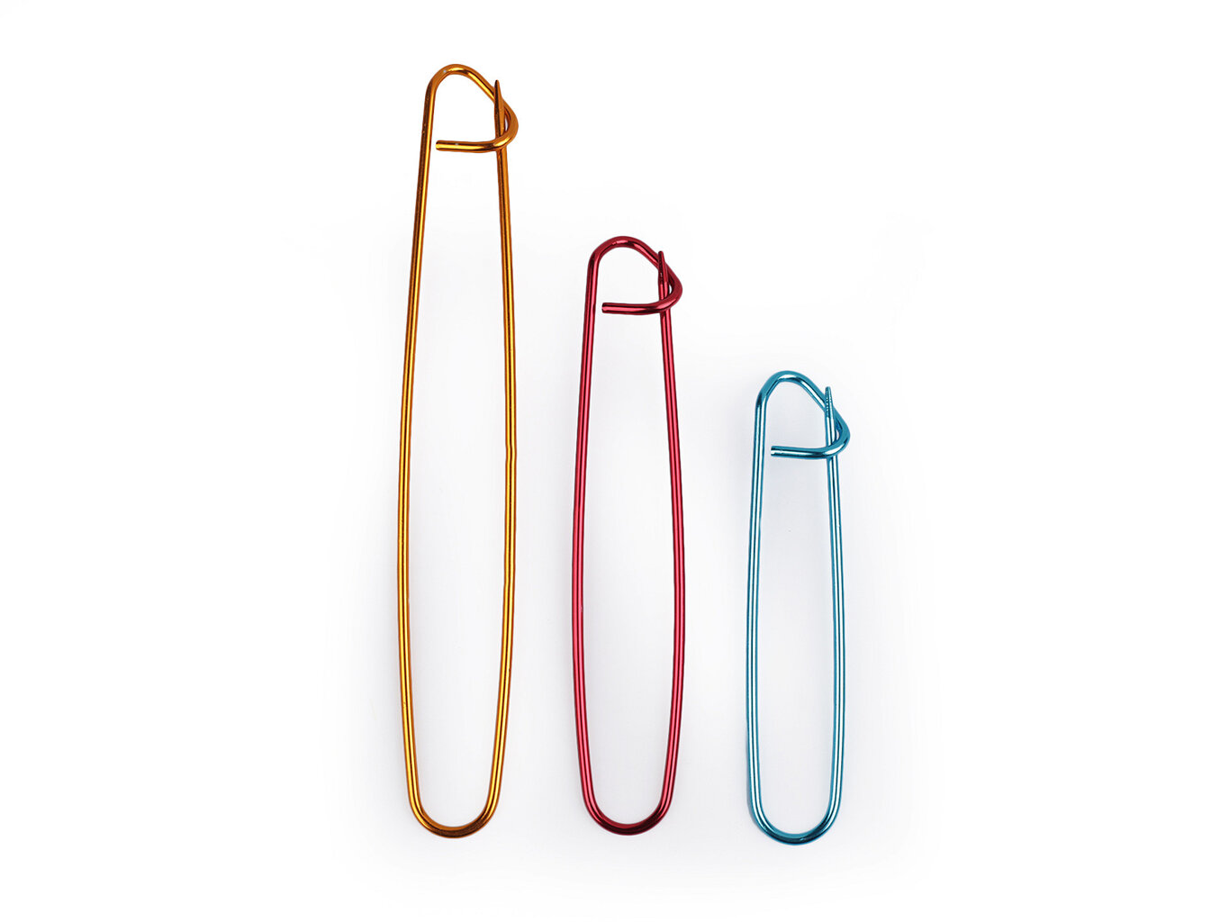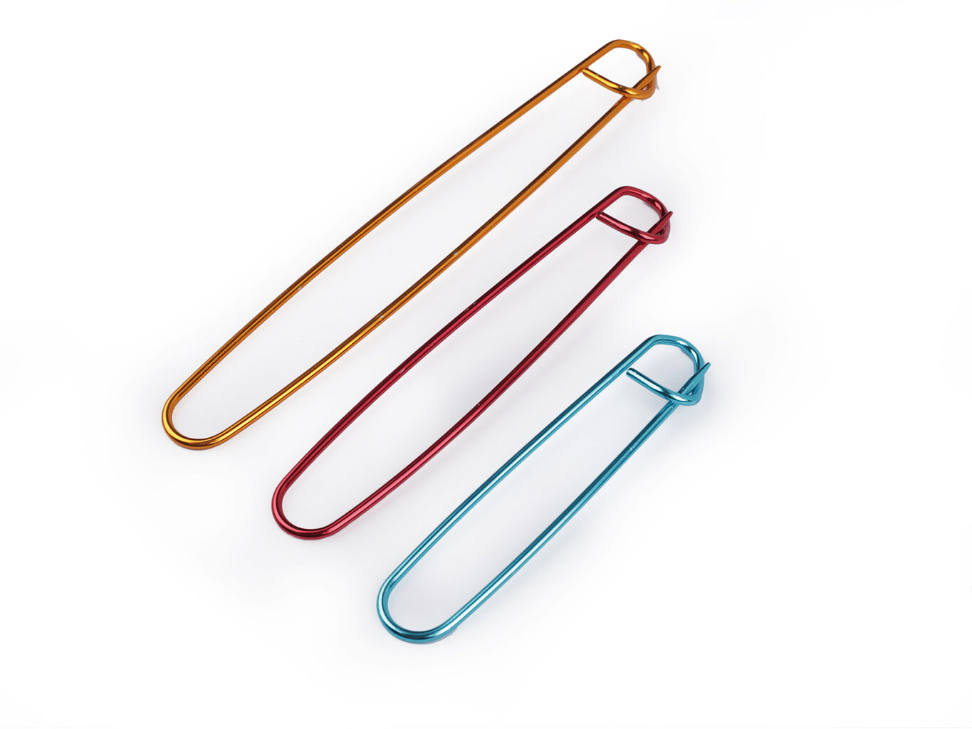 Zavírací jehlice z lehoučkého hliníku a s barevnou povrchovou úpravou jsou neocenitelnou pomůckou při pletení. Pomocké špendlíky umožňují uzavřít část úpletu, aby se nevyvlékla očka.