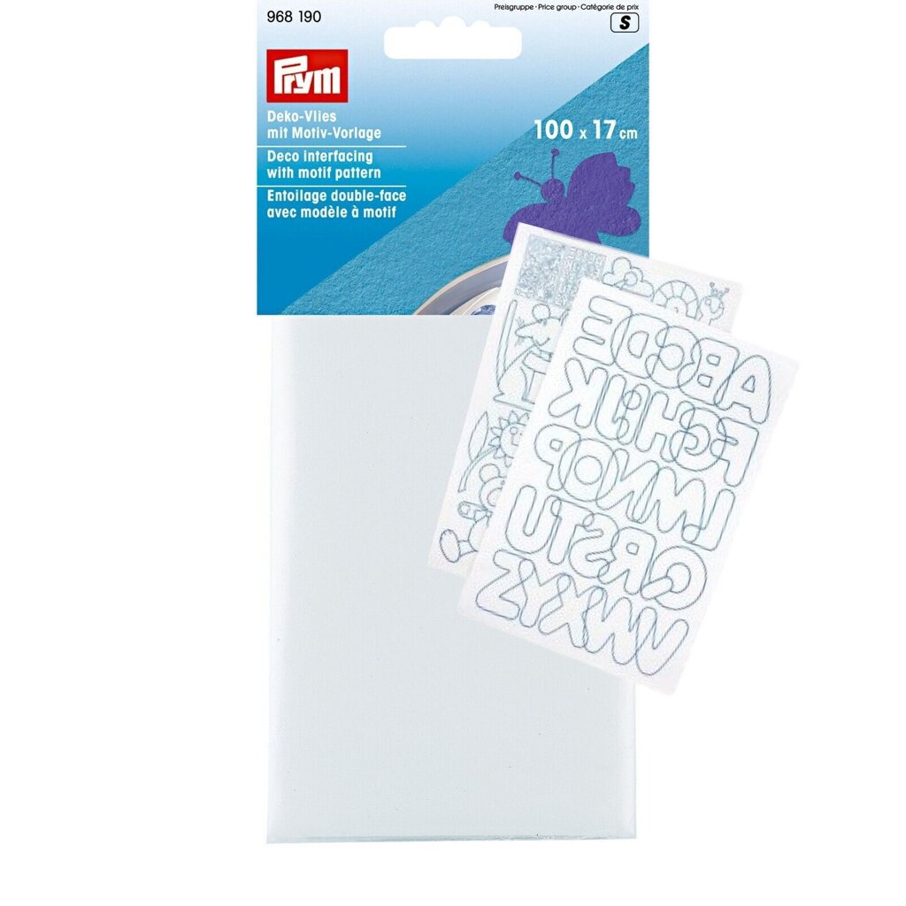 Obojstranný zažehľovací vlizelín so šablónami na tvorbu originálnych aplikácií. Šablóny s abecedou a detskými motívmi sú súčasťou balenia.