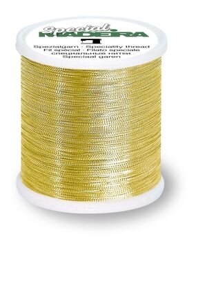 Metalická zlatá niť na strojové šitie a vyšívanie, ktorá obsahuje 2% prírodného zlata. Špeciálna zlatá niť, ktorá dodá Vašej kreativite originalitu. Zlatá niť dodá oblečeniu špeciálne efekty a vyšívanie punc luxusu. S touto kovovou niťou môžete šiť na všetkých bežných šijacích aj vyšívacích strojoch aj ručne vyšívať.